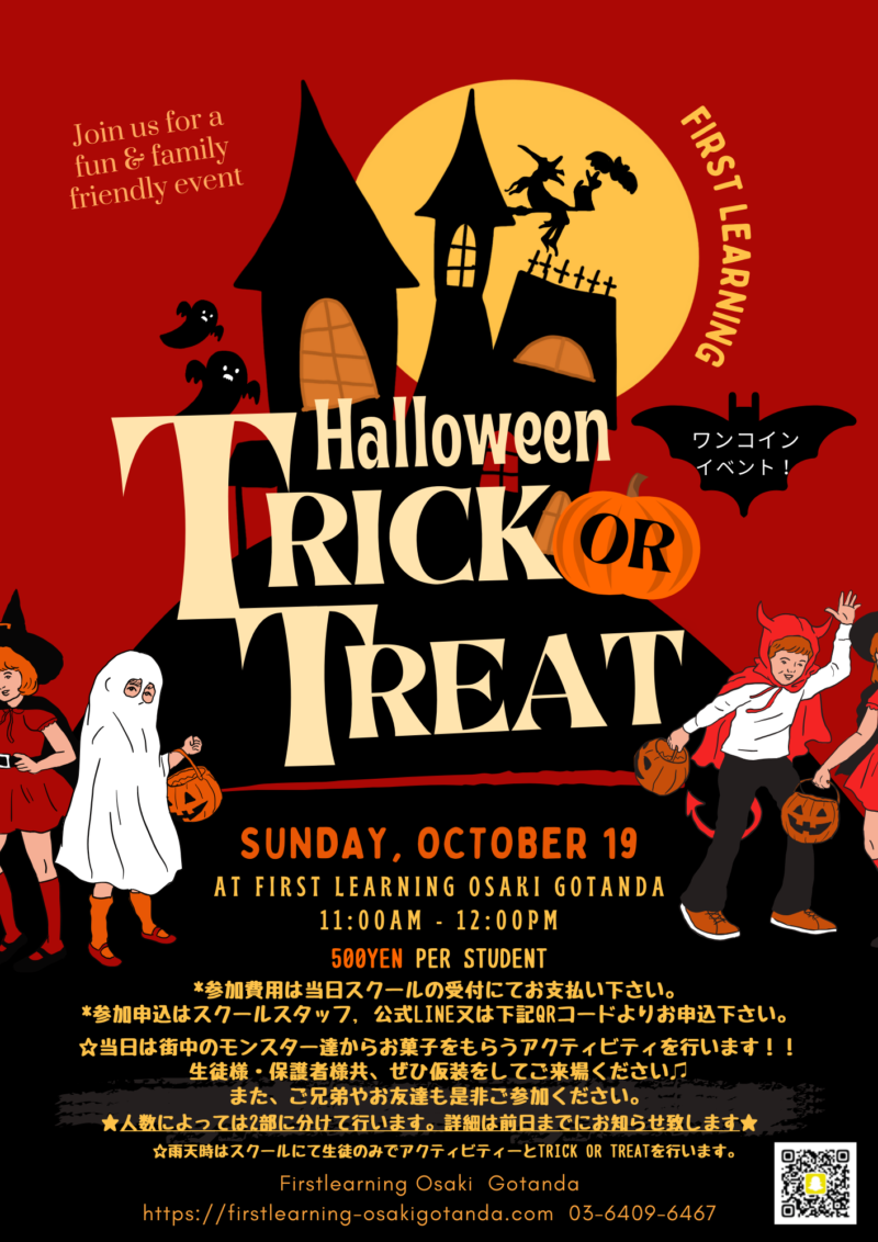 ファーストラーニング大崎五反田校では屋外にてモンスター達からお菓子をもらうクエストに出かけてもらいます!楽しい仮装で是非ご家族でお越しください!